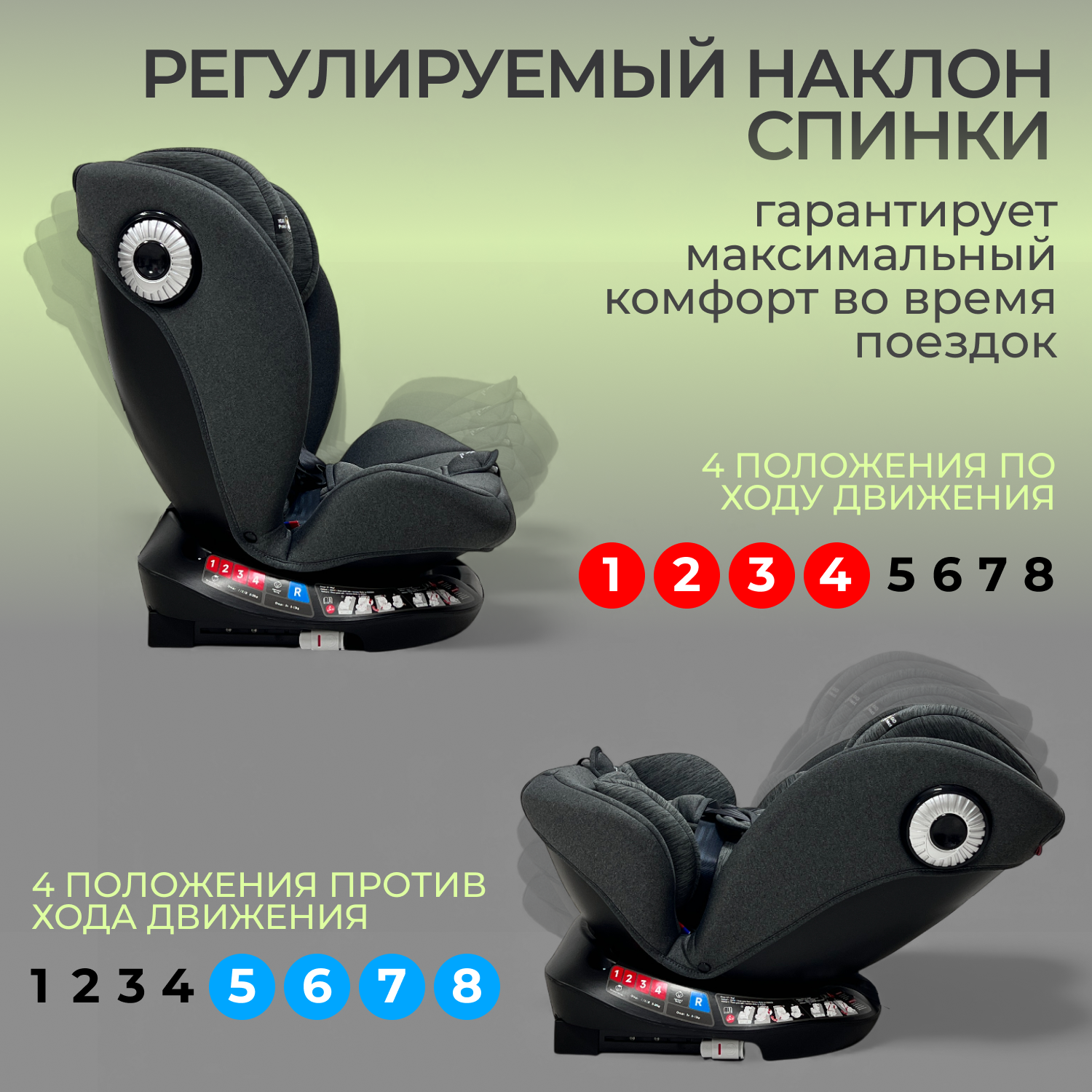 Спинка регулируется в 4 положениях по ходу движения и 4 против хода, включая максимальный угол наклона 165° — оптимальный для комфортного и безопасного сна самых маленьких детей.