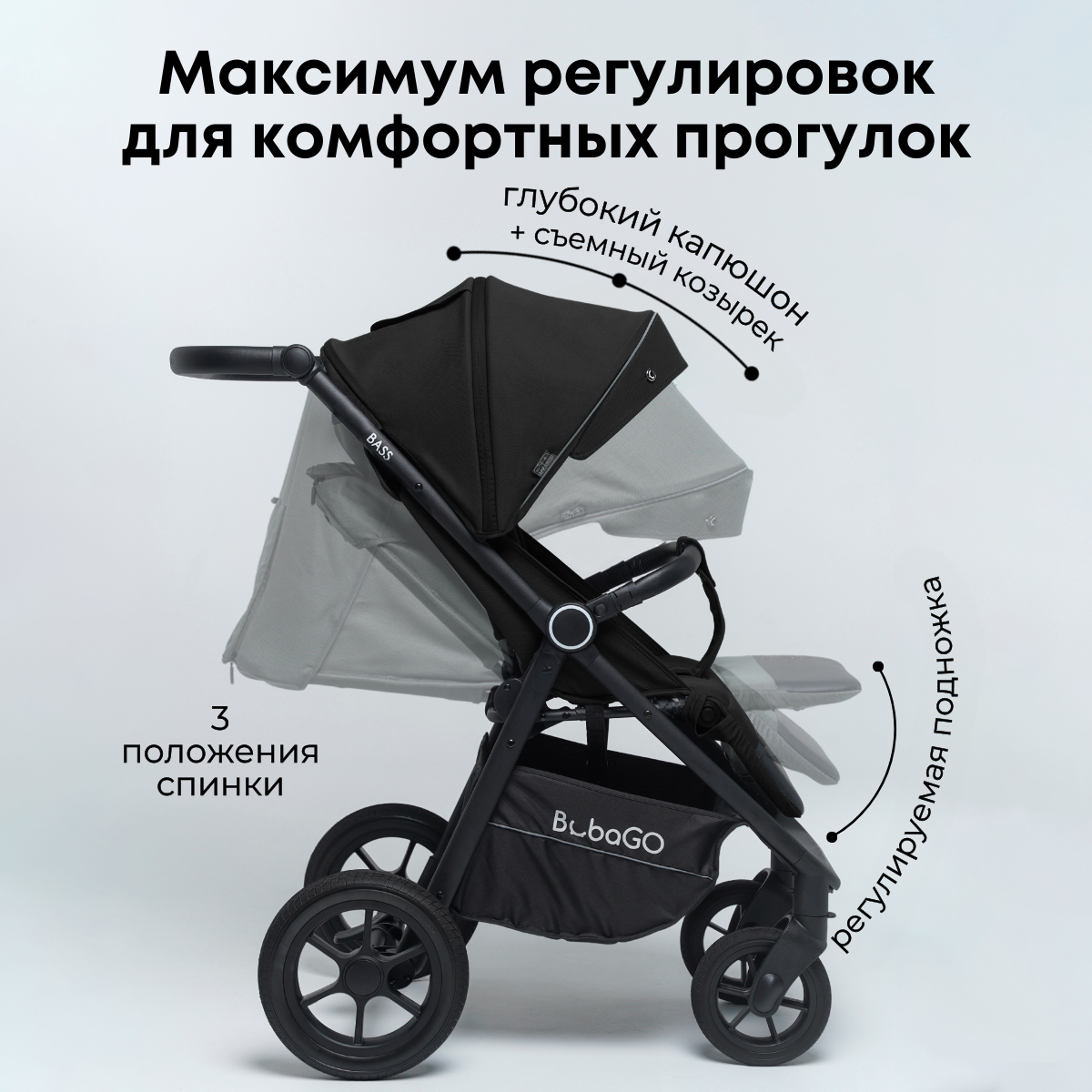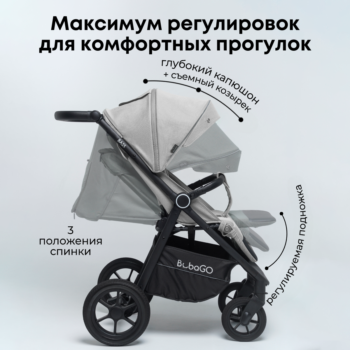 С этой проходимой и легкоуправляемой коляской, оснащенной комфортным сиденьем и регулируемой спинкой, включая горизонтальное положение, каждая прогулка с малышом станет приятным и комфортным времяпрепровождением. Кроме того, данная модель обеспечивает превосходную безопасность вашему малышу: пятиточечные ремни надежно фиксируют даже самых активных малышей, а капюшон надежно защищает от непогоды и яркого солнца. Вместительная корзина BubaGO BASS оценена каждой заботливой мамой – помимо игрушек ребенка, в нее поместятся все необходимые покупки. Есть удобный доступ в корзину, даже при разложенной спинке, а молния не допустит выпадения вещей при движении.