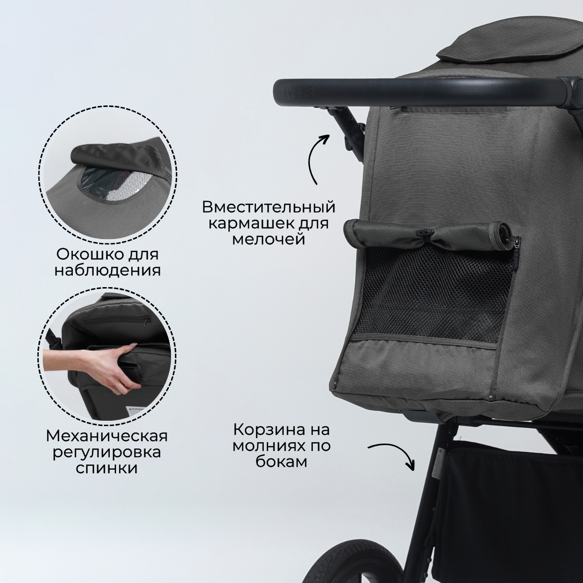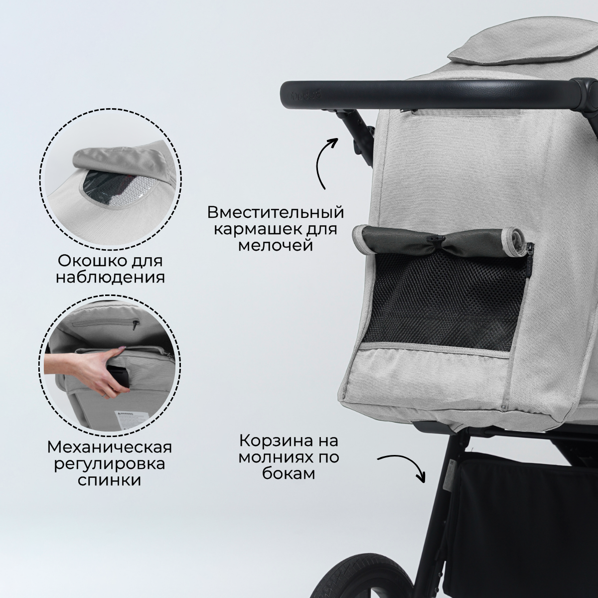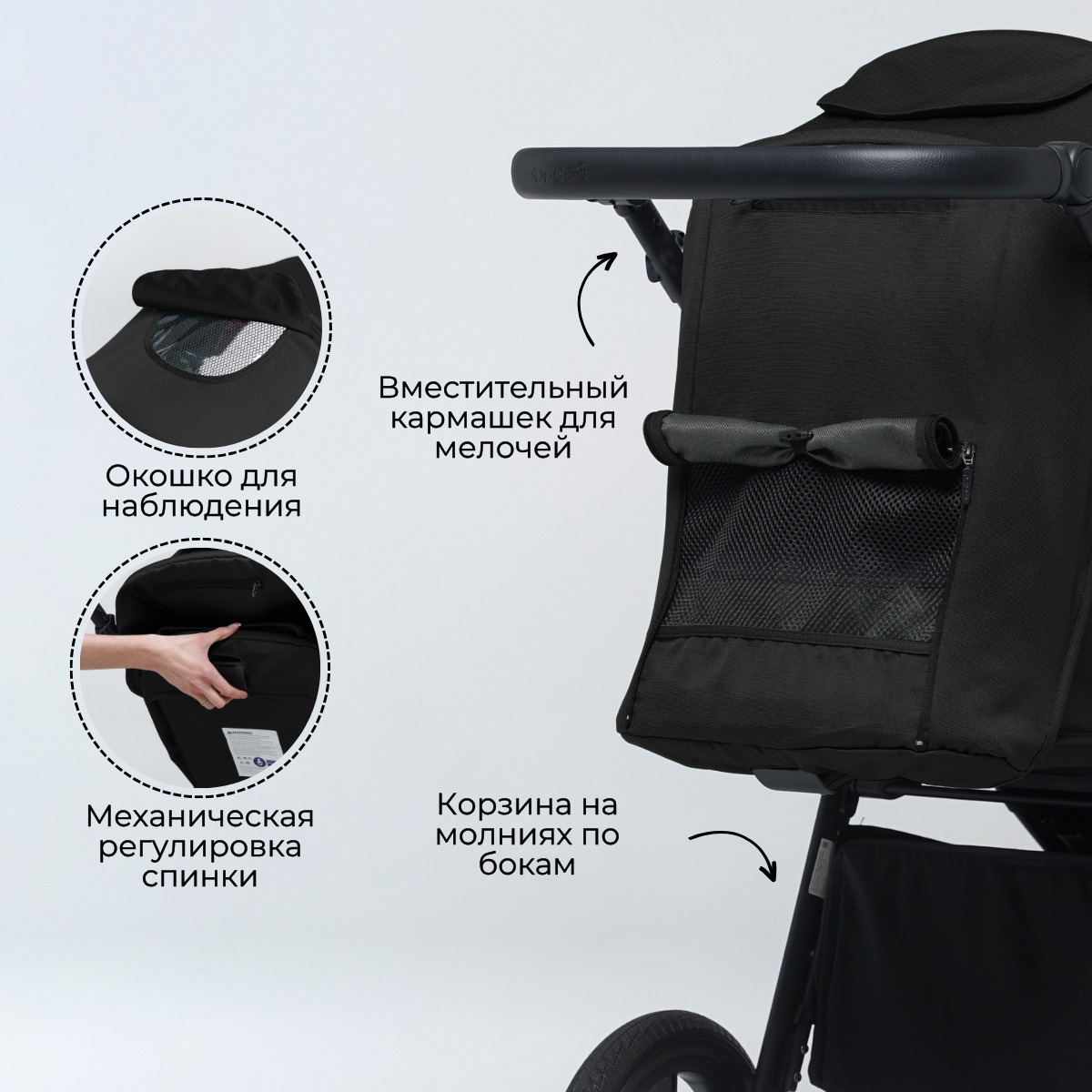 А над сиденьем есть еще кое-что не менее важное – капюшон. Давайте по порядку: сам капюшон невероятно глубокий, с большим количеством положений регулировки, вплоть до самого бампера. Малышу под этим капюшоном не будет страшен ни солнце, ни дождь, ни ветер, ни снег, так как ткань – водонепроницаемая с солнцезащитным покрытием. Ну и вам не стоит переживать, что за таким серьезным капюшоном вы не будете видеть ребенка – все предусмотрено, в этом вас будет выручать окошко на магните со светорассеивателем.