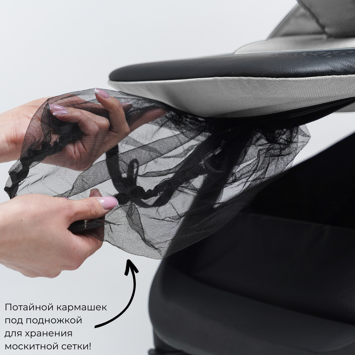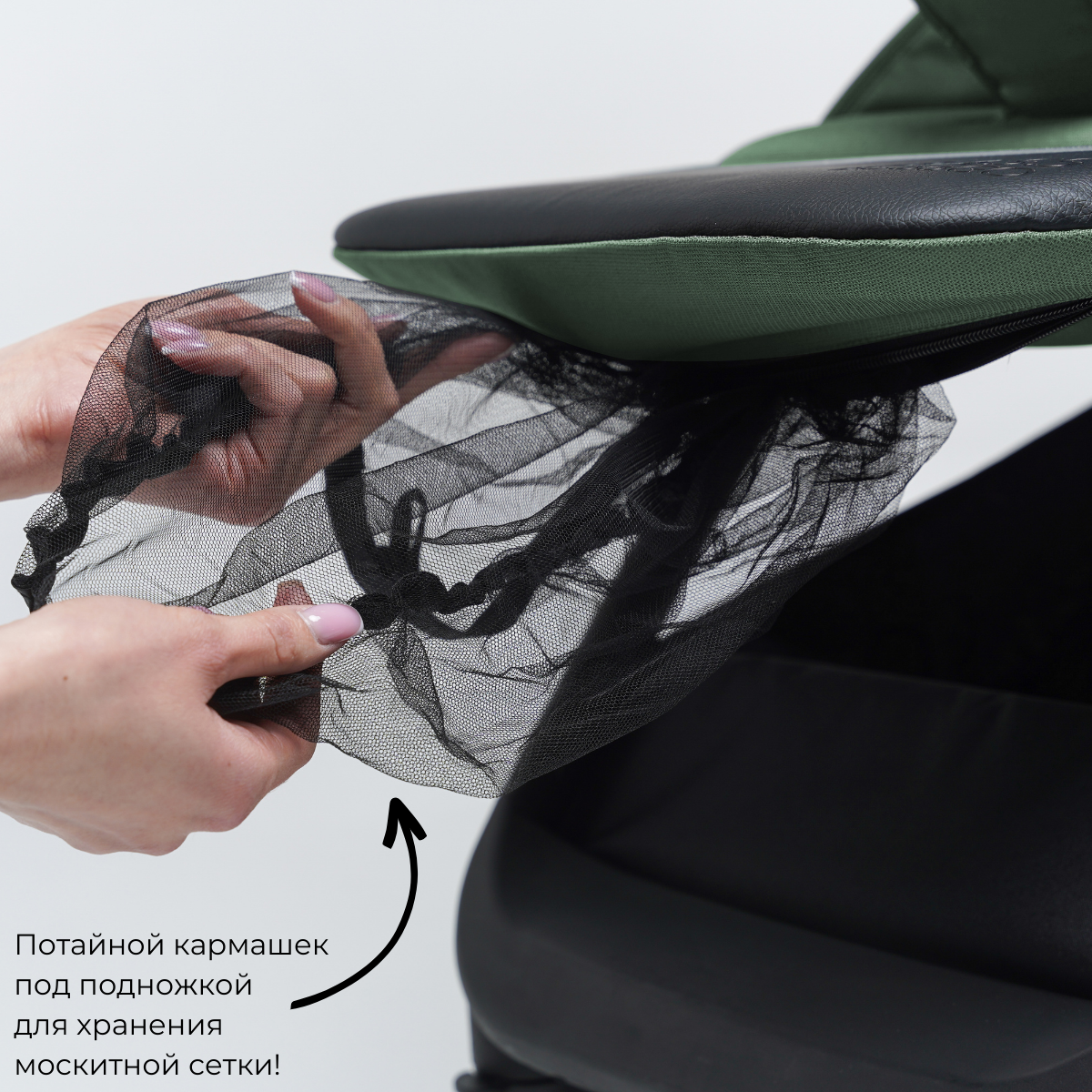 А если заглянуть под нее, то увидим маленький бонус: это кармашек, в котором хранится москитная сетка. Во-первых, вы ее никогда не потеряете, во-вторых, она будет всегда с вами, да и сам кармашек можете использовать под любые нужды.