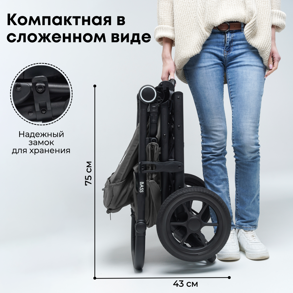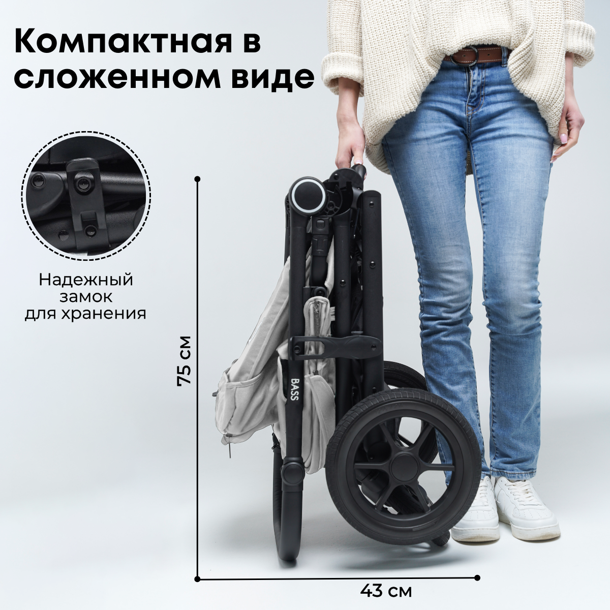 Несмотря на внушительные габариты, прогулочная коляска BubaGO BASS легко и компактно складывается одной рукой тканью внутрь по принципу «книжка», для удобства хранения и переноски имеет транспортировочный замок.