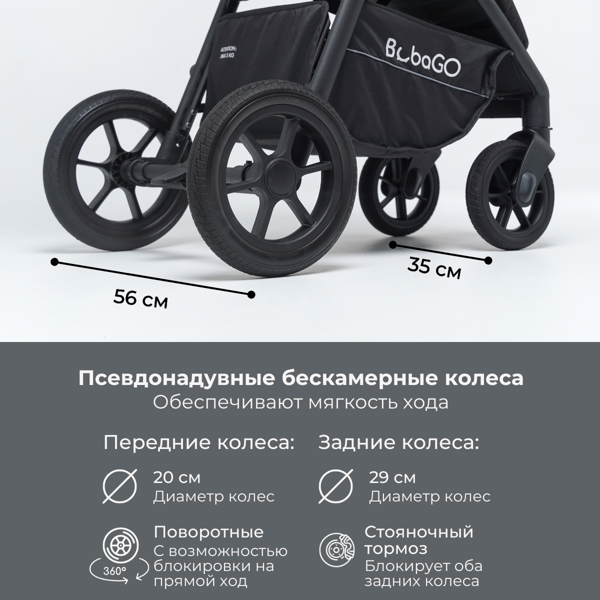 Прежде всего, что делает BubaGO BASS коляской, способной проходить в тех местах, которые будут объезжать все остальные? Это, конечно же, колеса! Во-первых, псевдонадувные колеса из бескамерной резины не боятся проколов и обеспечивают максимально мягкий ход, а во-вторых – только посмотрите на их размер: диаметр передних – 20 см, а задних – 29 см. Такие колеса легко проедут по любому бездорожью, грязи и глубокому снегу.
