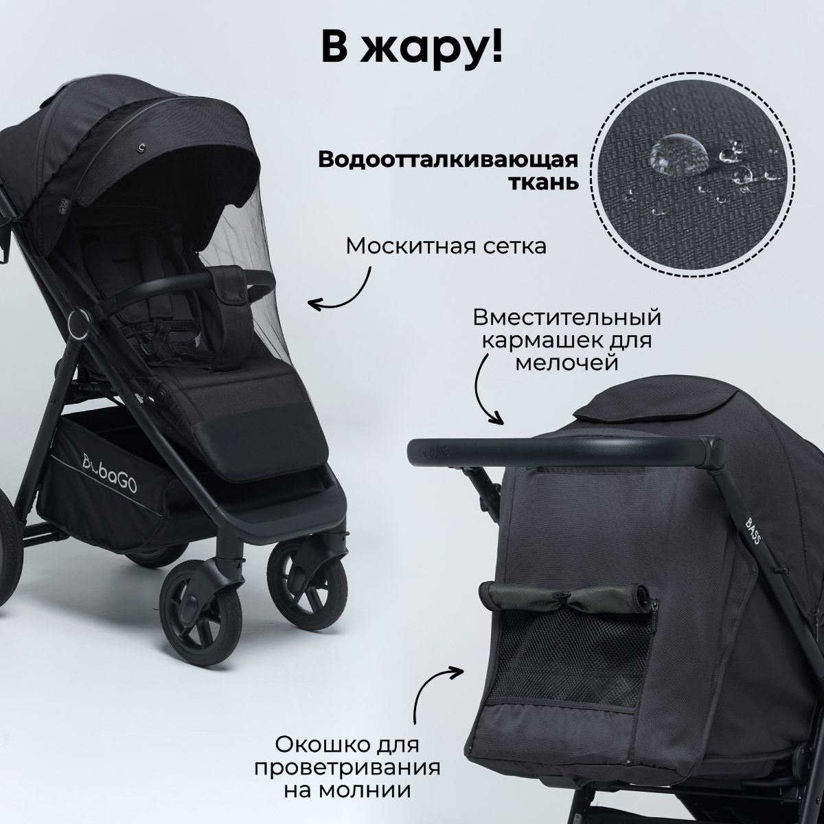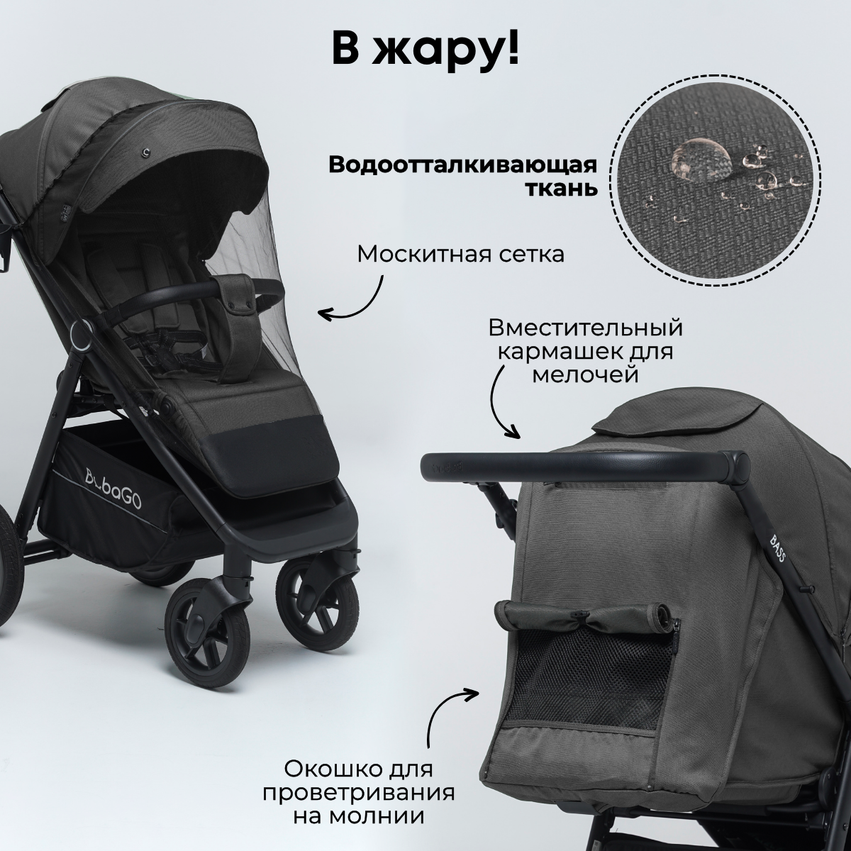 Кроме москитной сетки в комплекте есть дождевик, подстаканник, а также вместительная сумка-рюкзак, которая крепится на родительской ручке на удобных «ушках». Уже традиционная фишка BubaGO – рюкзачок превращается в плотный и удобный пеленальный матрасик!
