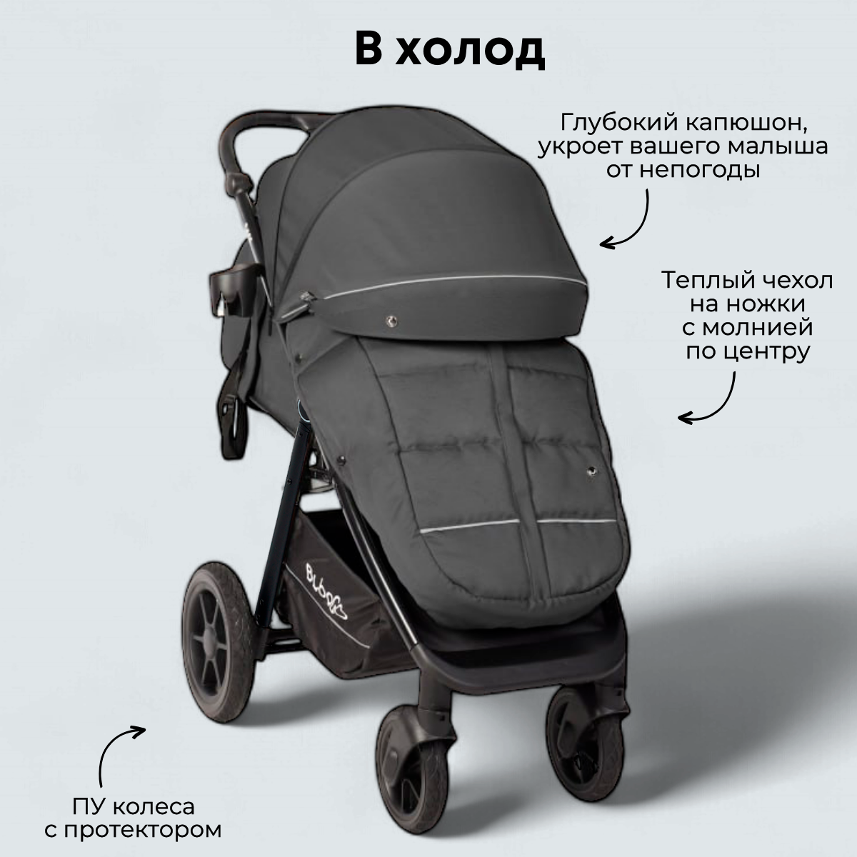 В холодную погоду малыша надежно защитит теплый чехол на ножки с молнией посередине. Вы только представьте: это позволит вам не снимать его полностью, просто расстегнули молнию – и посадили или же достали малыша.