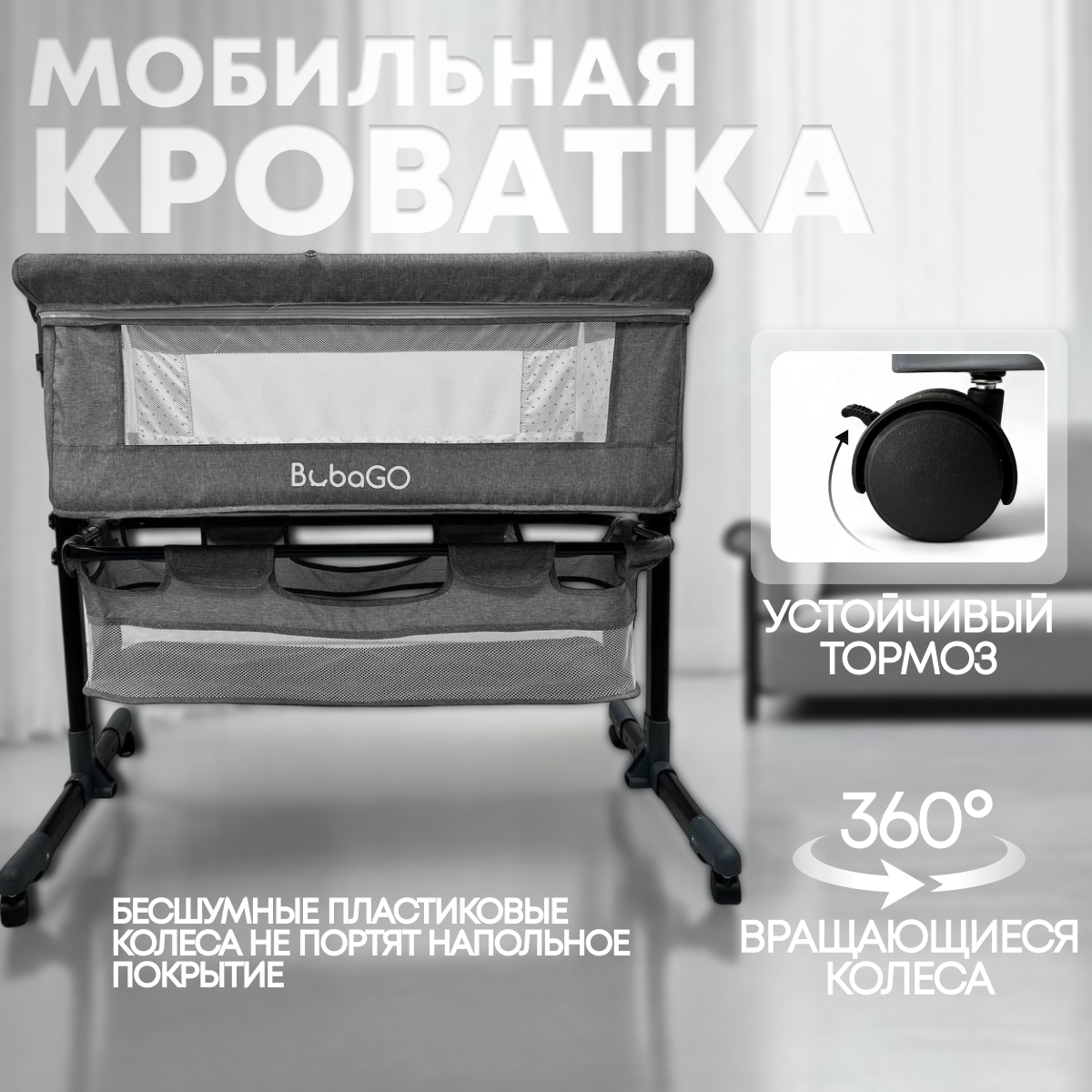 - Бесшумные пластиковые колёсики вращаются на 360°, легко фиксируются устойчивым тормозом.
