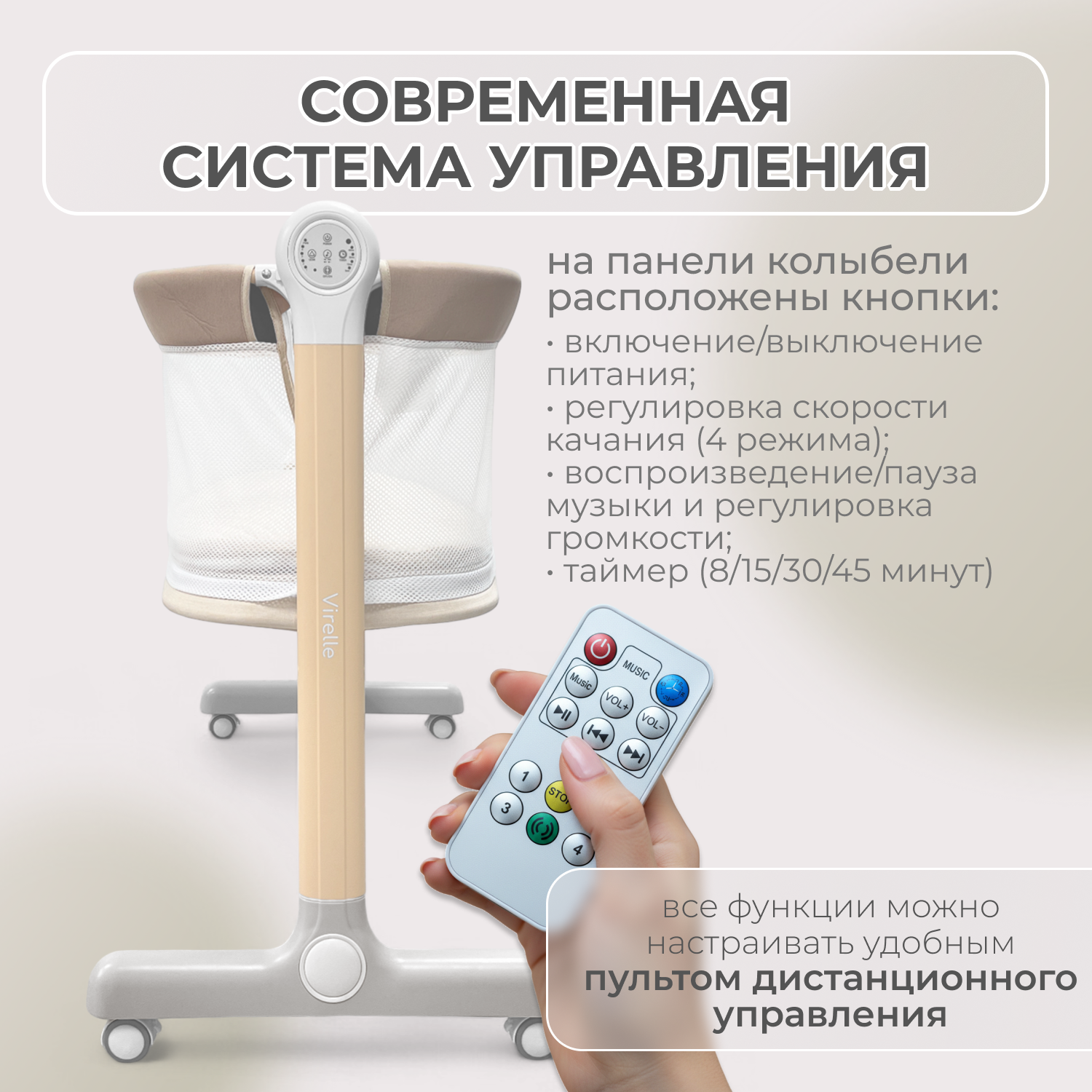 Пульт дистанционного управления дублирует все функции — вы можете управлять колыбелью, не вставая с кровати.
