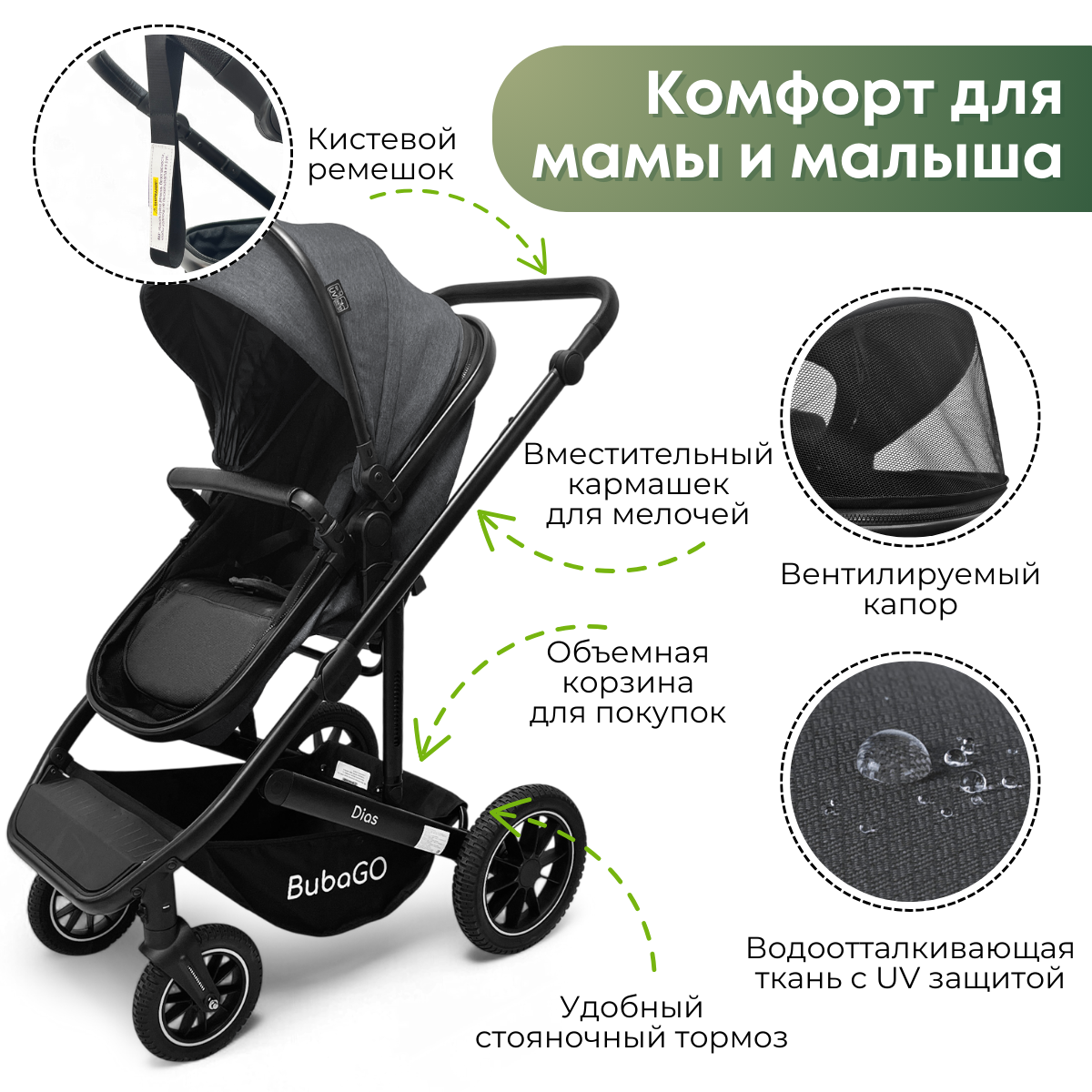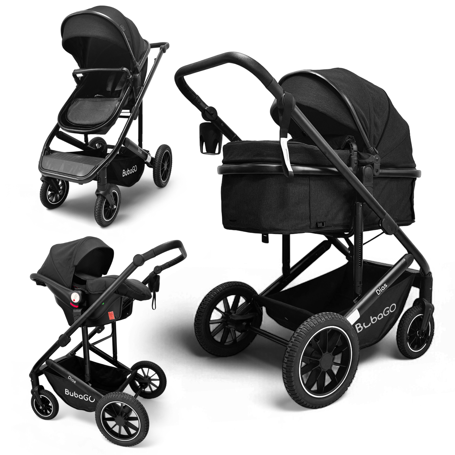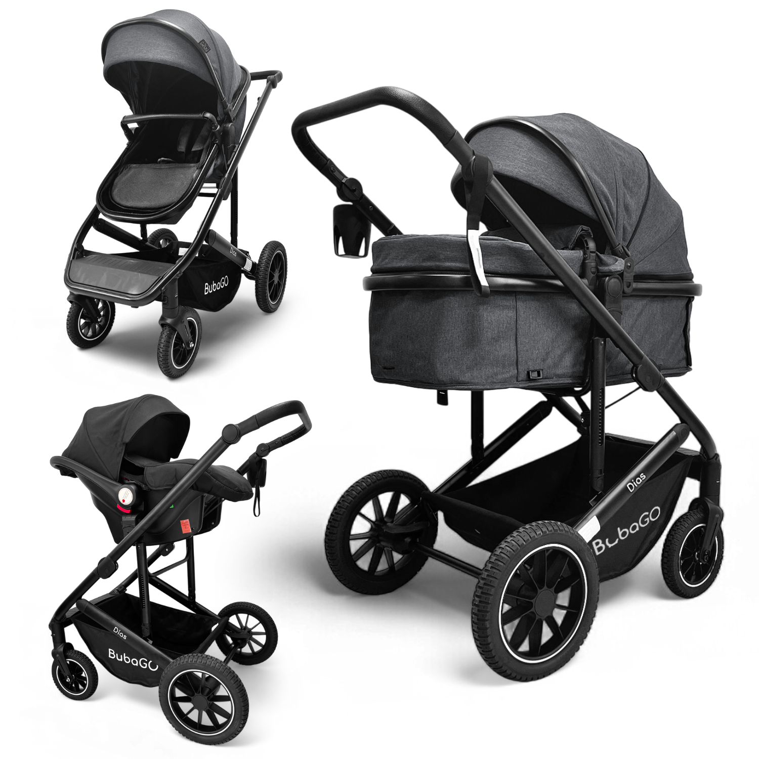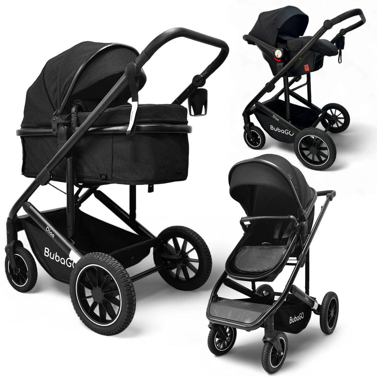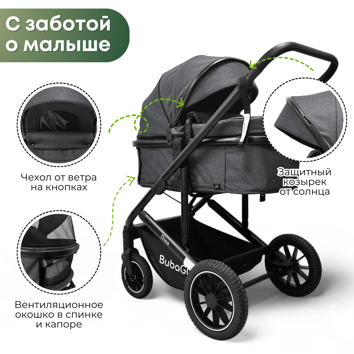 BubaGO Dias — это практичная и многофункциональная коляска, которая заменяет сразу три отдельных изделия: люльку для новорождённого, прогулочную коляску для подросшего ребёнка и автолюльку для безопасных поездок в машине.