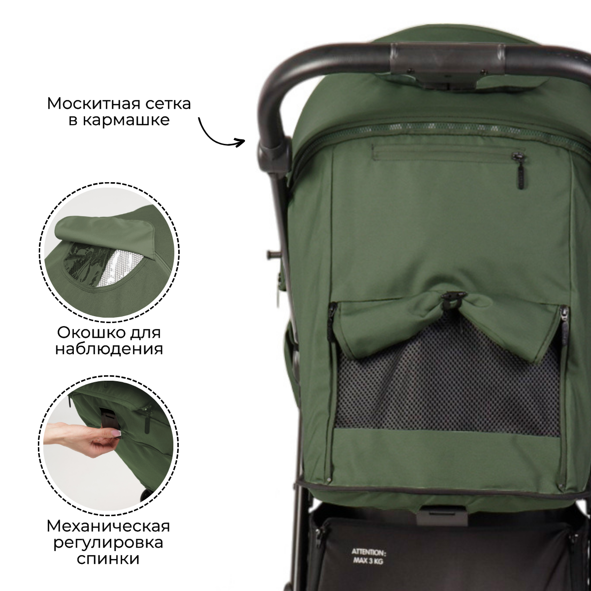 А над сиденьем есть еще кое-что не менее важное – капюшон. Давайте по порядку: сам капюшон невероятно глубокий, с большим количеством положений регулировки, вплоть до самого бампера. Малышу под этим капюшоном не будет страшен ни солнце, ни дождь, ни ветер, ни снег, так как ткань – водонепроницаемая с солнцезащитным покрытием. В обновленной модели 2025 мы использовали ткань повышенной плотности 600D в привлекательных спокойных оттенках. Ну и вам не стоит переживать, что за таким серьезным капюшоном вы не будете видеть ребенка – все предусмотрено, в этом вас будет выручать окошко на магните со светорассеивателем.