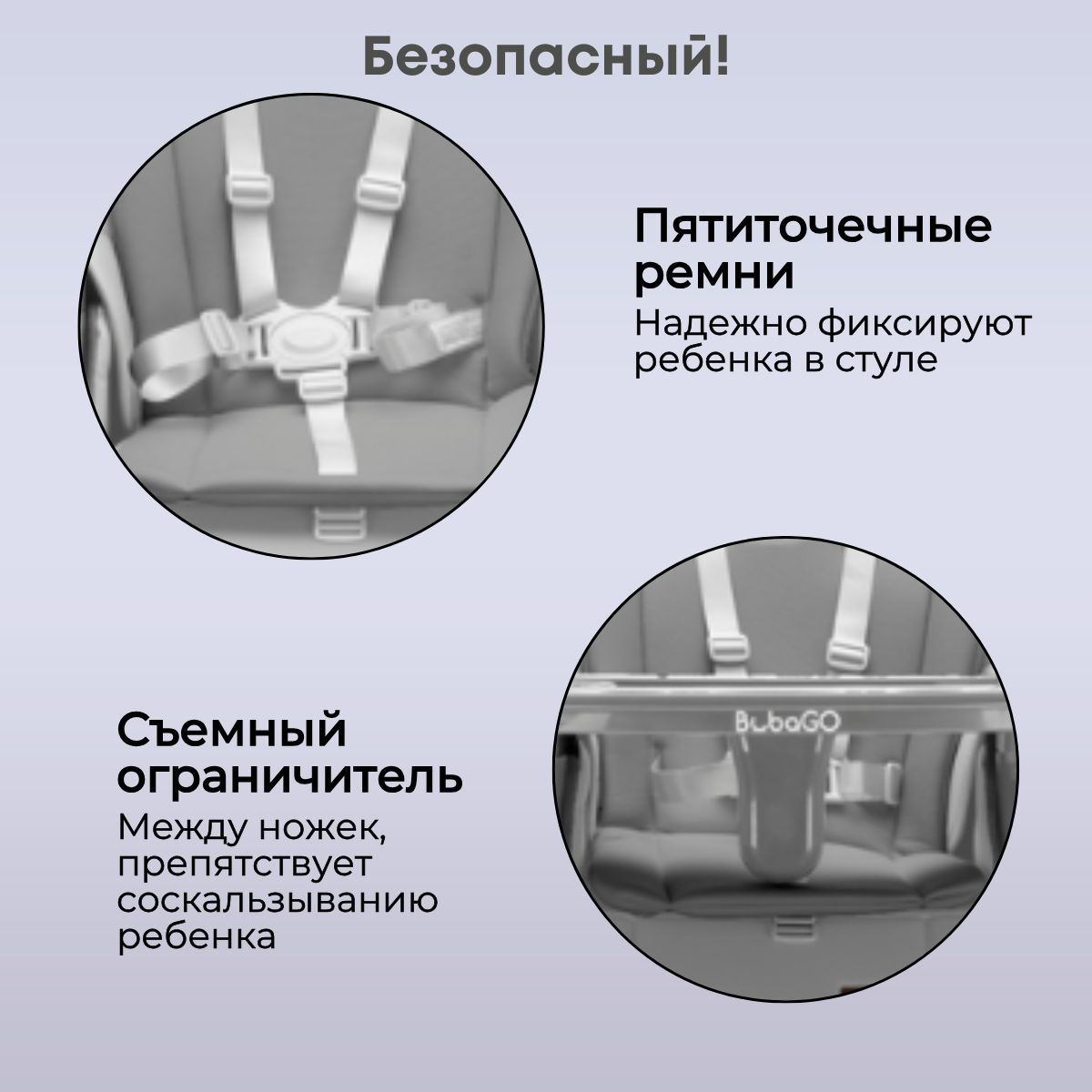 За безопасность ребёнка отвечают пятиточечные ремни безопасности и съёмный ограничитель между ножек. Они надёжно фиксируют малыша и помогают родителям быть спокойными в любой ситуации.