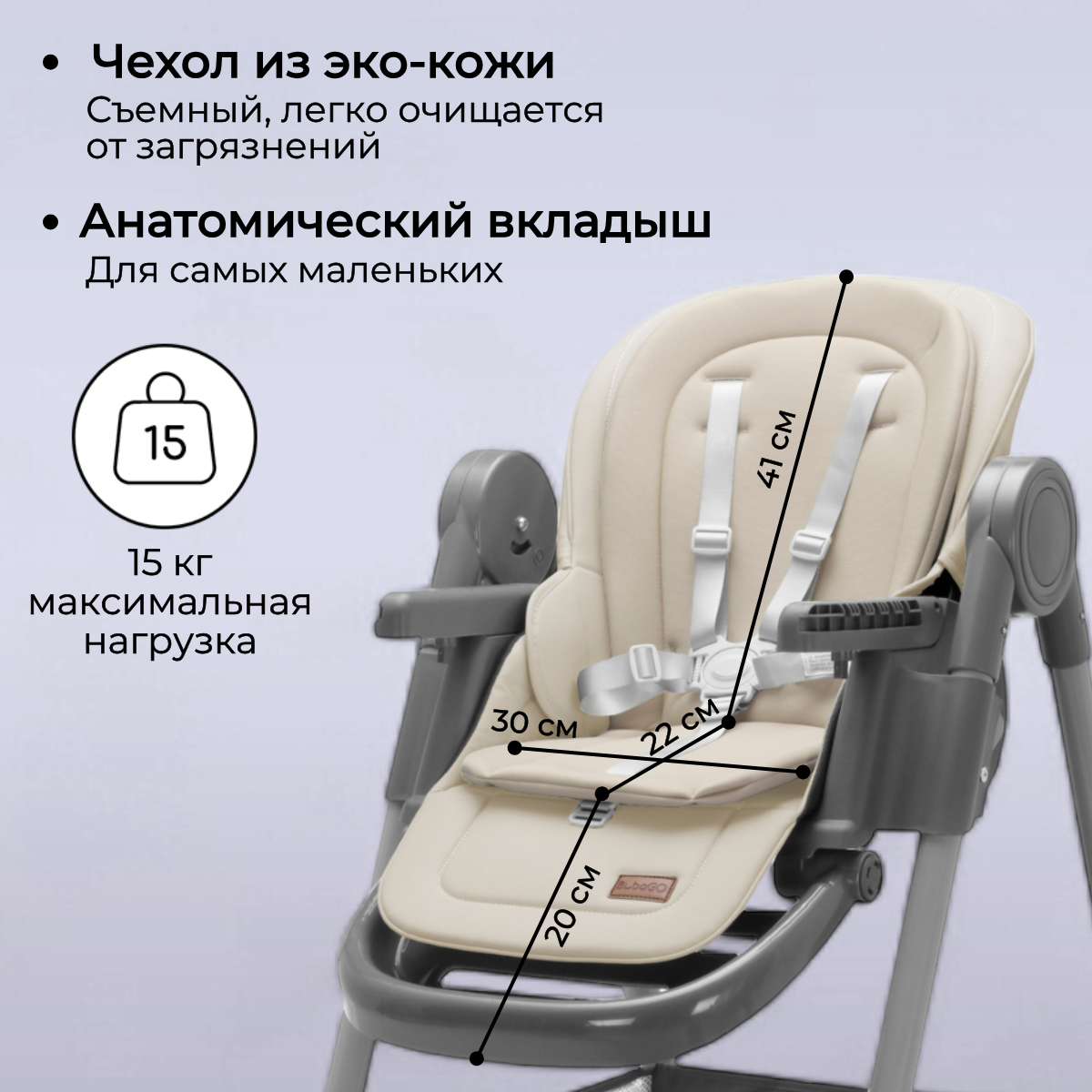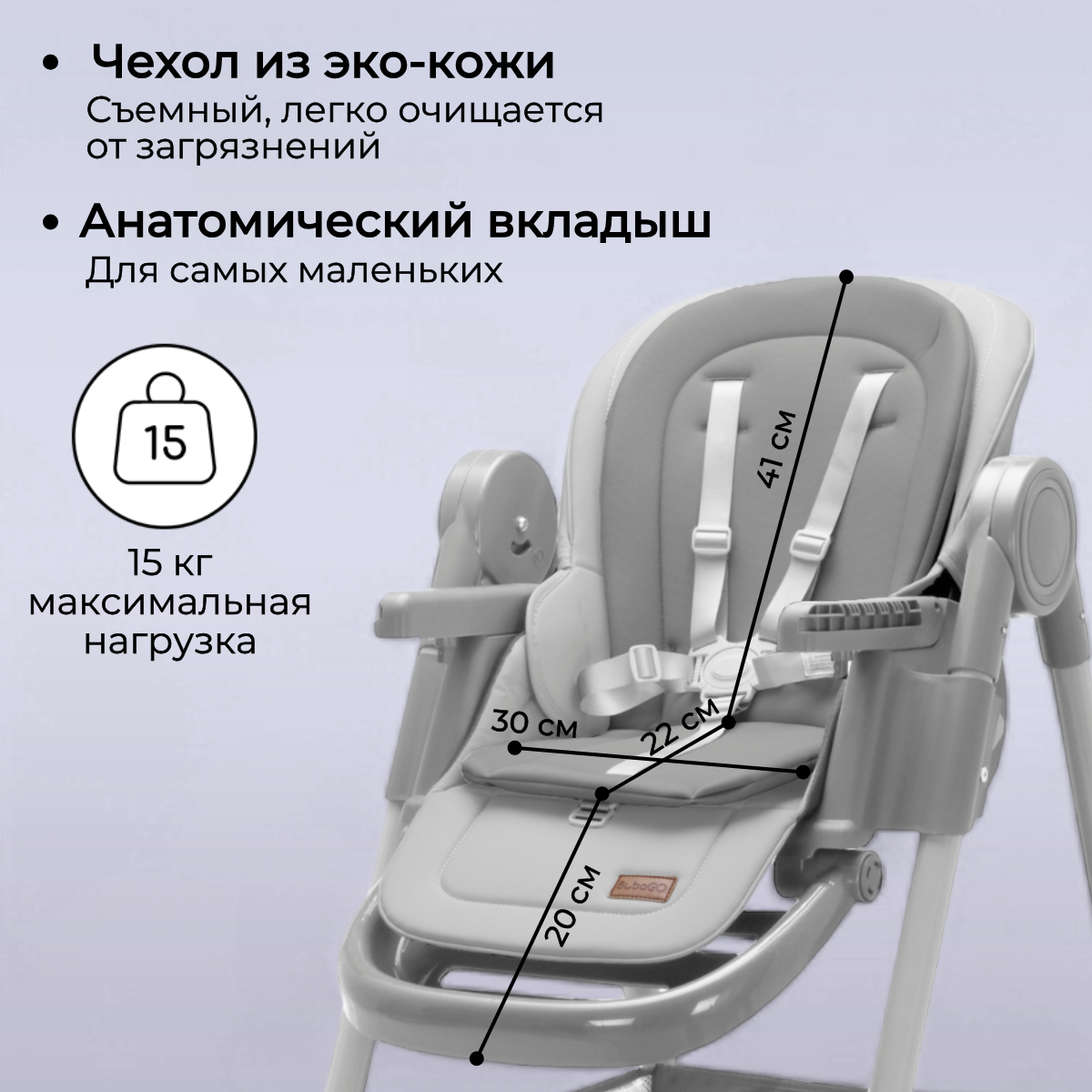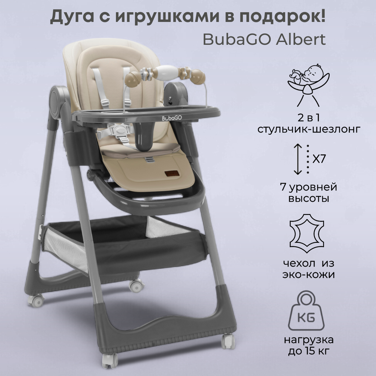 BubaGO Albert — это практичный и компактный стульчик-шезлонг, созданный для комфортного кормления, игр и отдыха малыша дома. Он легко вписывается в интерьер кухни или столовой, не занимает много места и становится надёжным помощником для родителей в ежедневных заботах.