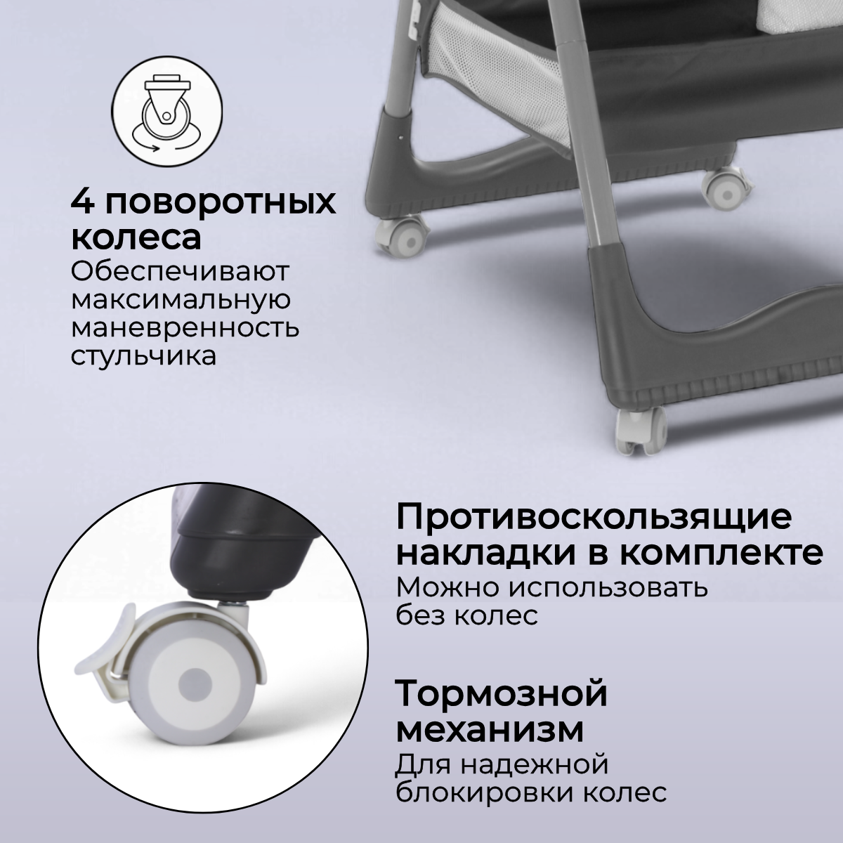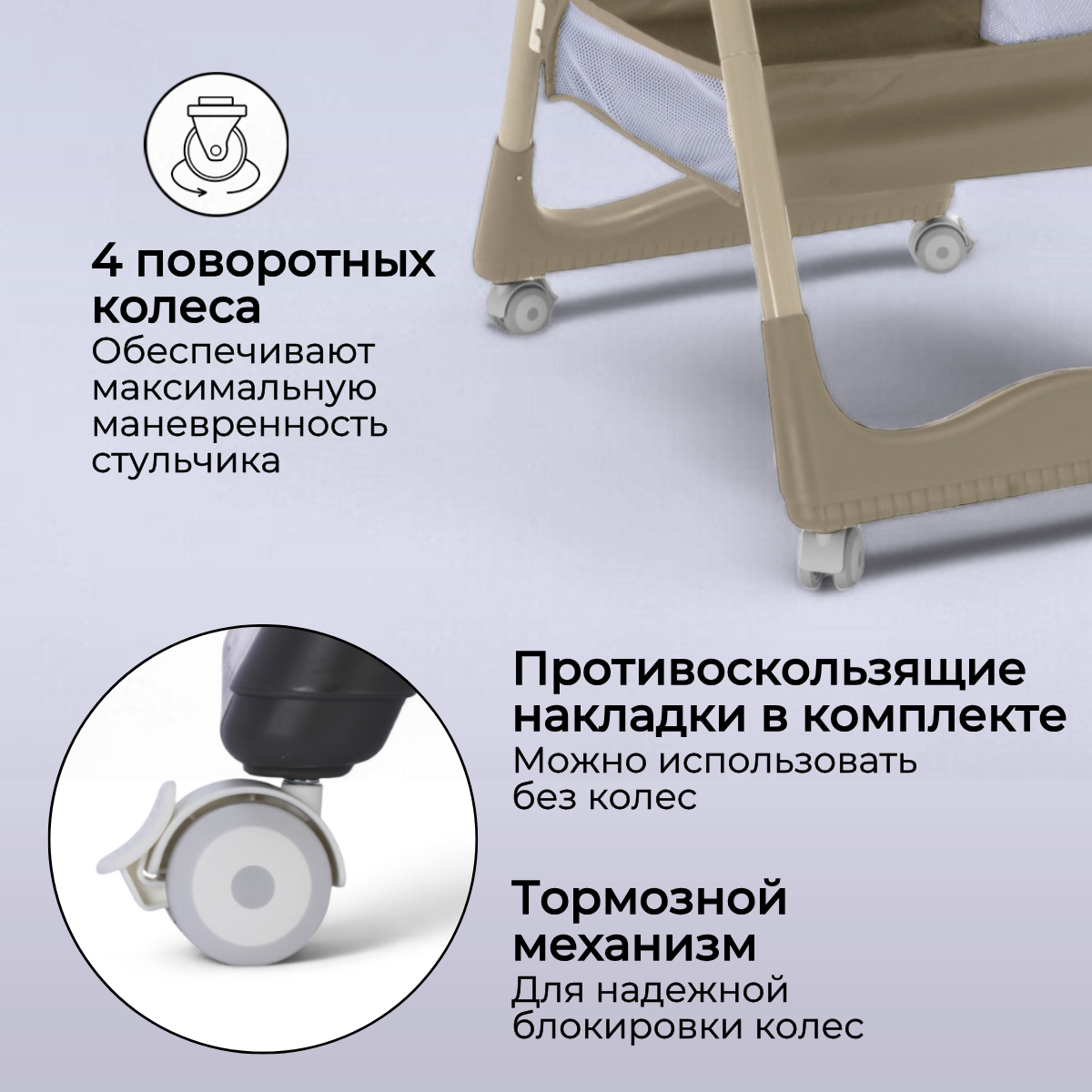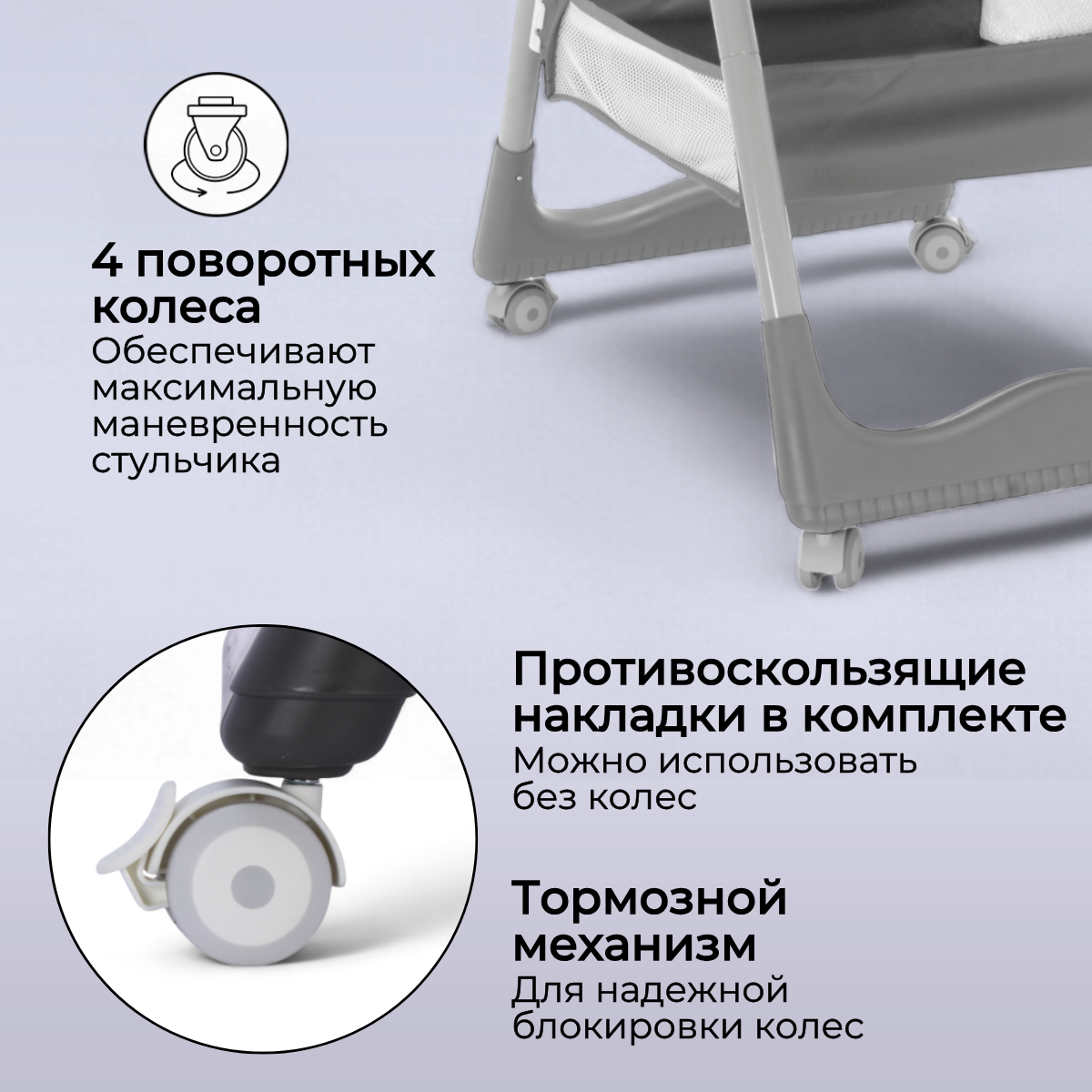 BubaGO Albert оснащён съёмными прорезиненными колёсами с stop-фиксаторами, благодаря которым стульчик легко перемещается по дому. Колёса не шумят, не царапают напольное покрытие и при необходимости снимаются — в этом случае стульчик устойчиво стоит на ножках со специальными противоскользящими вставками.
