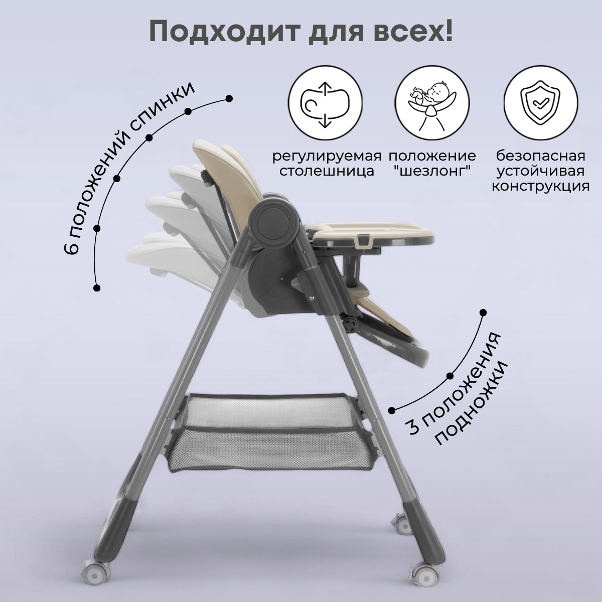 Спинка и подножка стульчика регулируются в 6 удобных положениях, позволяя малышу комфортно расположиться как для приёма пищи, так и для отдыха в полулежащем положении. 7 уровней регулировки высоты дают возможность точно подстроить стульчик под любой обеденный стол или зону для игр. Поднимающиеся подлокотники позволяют максимально близко подвинуть стульчик к столу, обеспечивая удобство и контакт с семьёй.