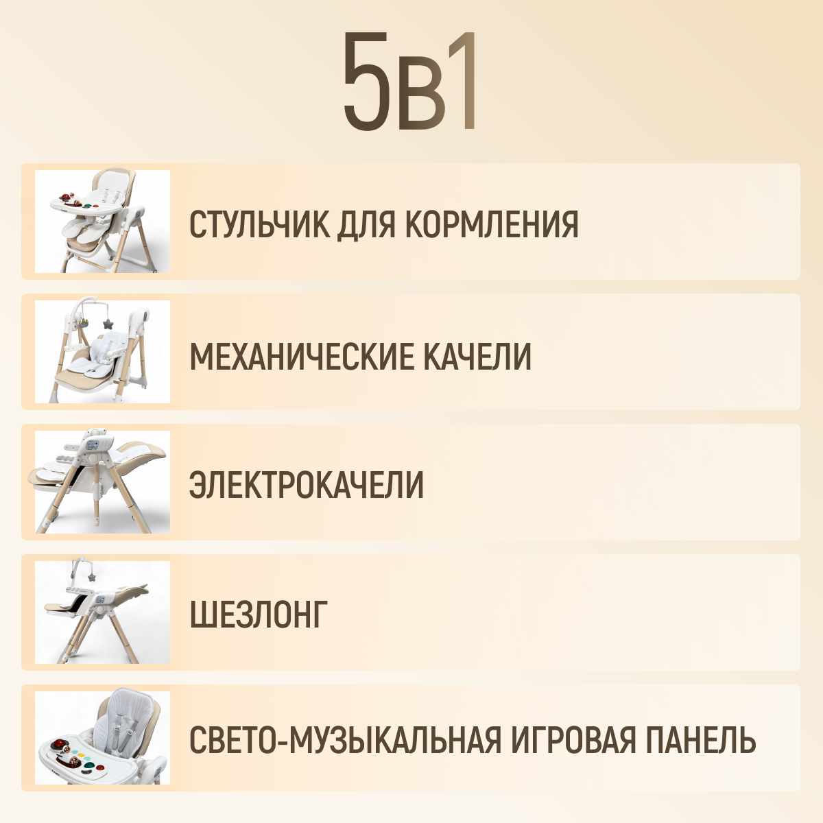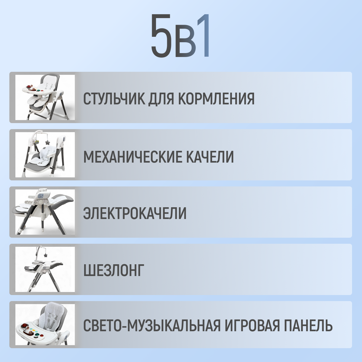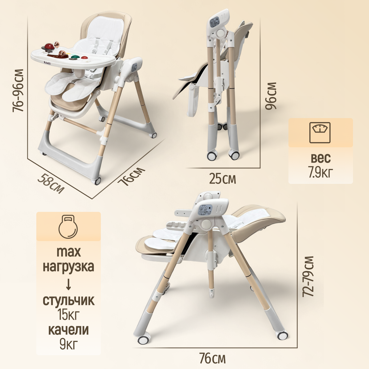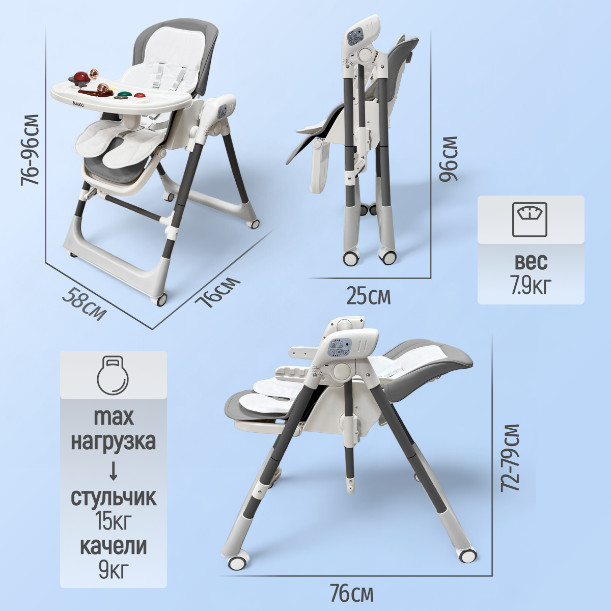 BubaGO Frida — это современная электрокачель-стульчик, созданная для спокойствия малыша и комфорта родителей. Она мягко укачивает, помогает расслабиться и уснуть, а также со временем превращается в полноценный стульчик для кормления, подстраиваясь под рост и потребности ребёнка.