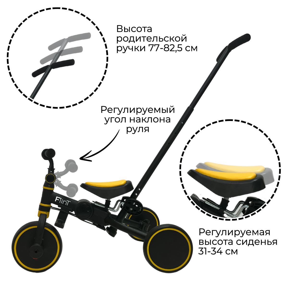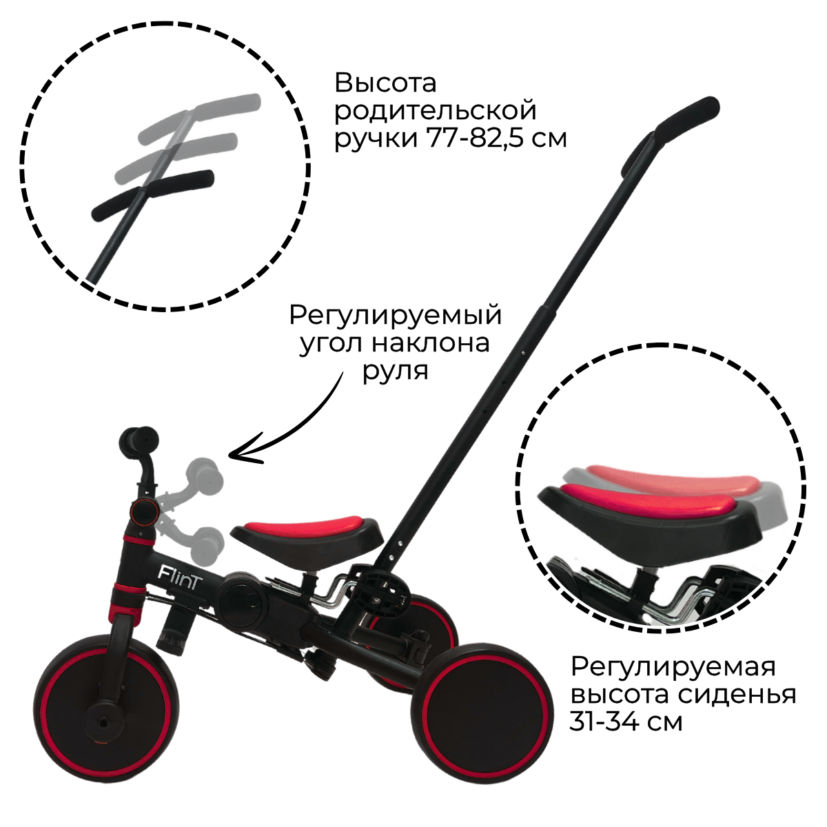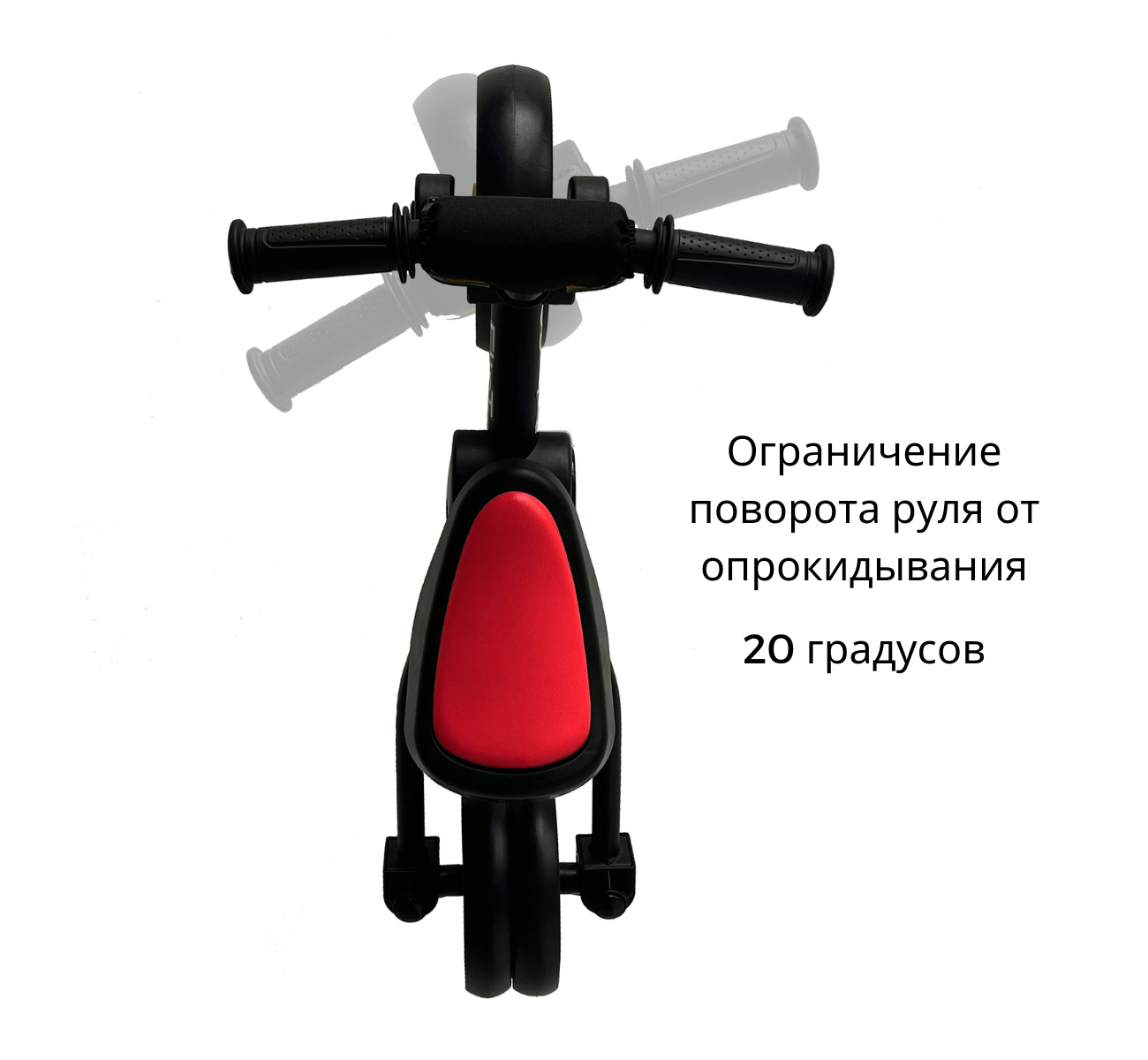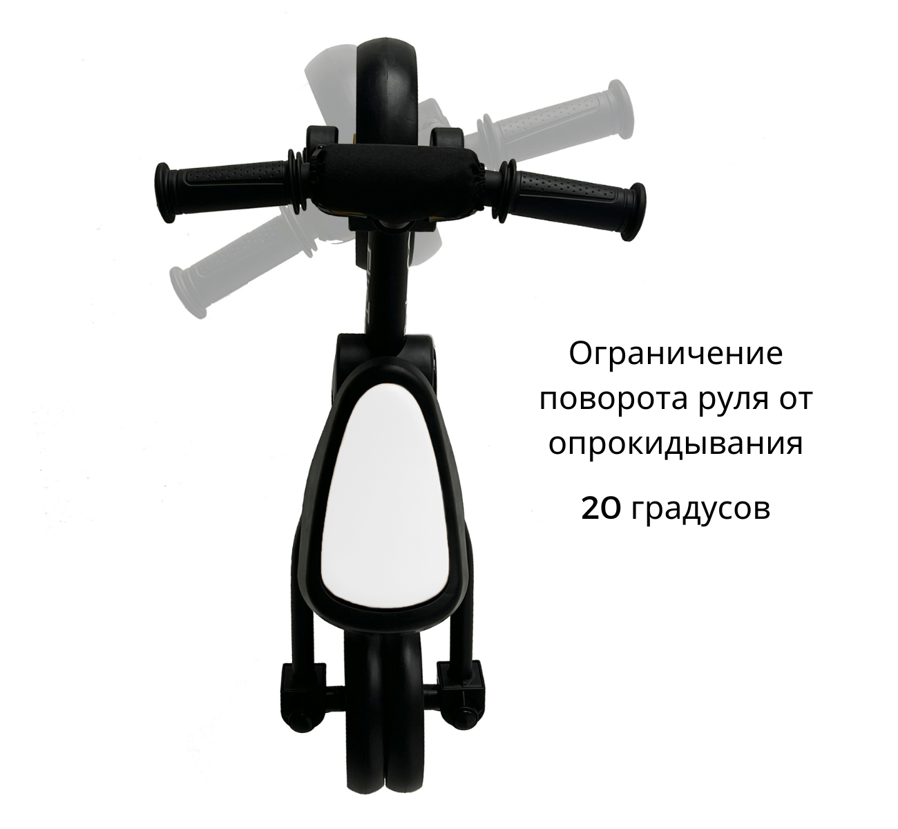 Для обеспечения максимальной безопасности и комфорта, велосипед оснащен ограничением поворота переднего колеса на 20 градусов и прорезиненными ручками для надежного захвата. Телескопическая родительская ручка регулируется по высоте, обеспечивая удобство для взрослых любого роста.