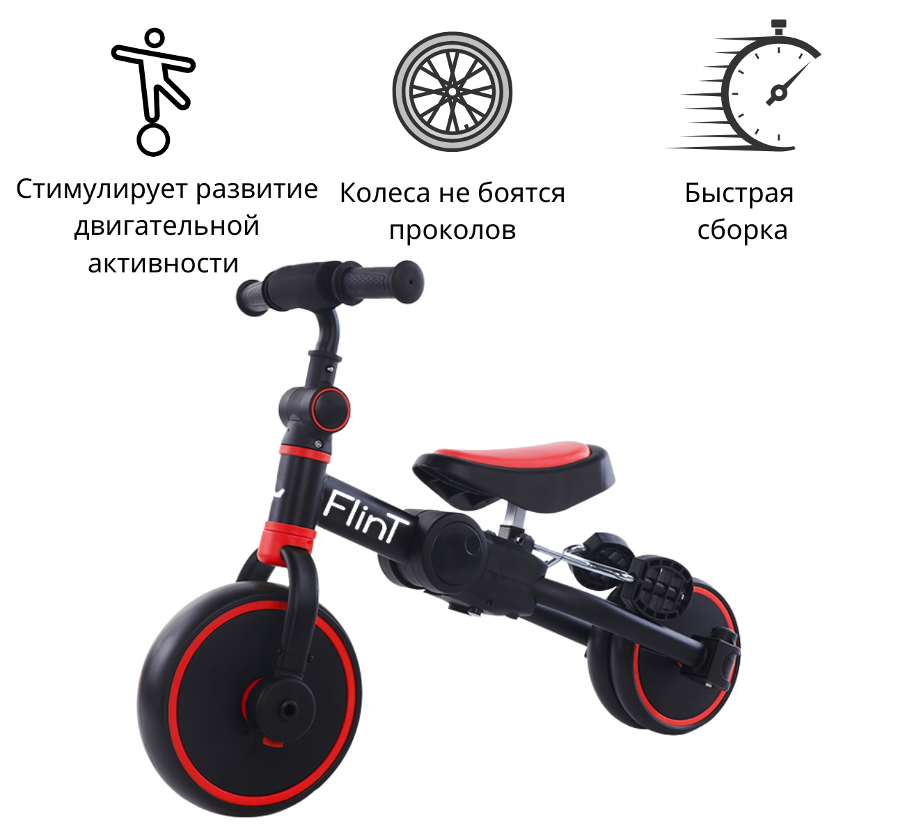 Трехколесный беговел: В начальной стадии, когда ребенок только учится управлять своим телом и находить баланс, педали и ручка сняты, позволяя малышу отталкиваться ногами и наслаждаться свободой движения.